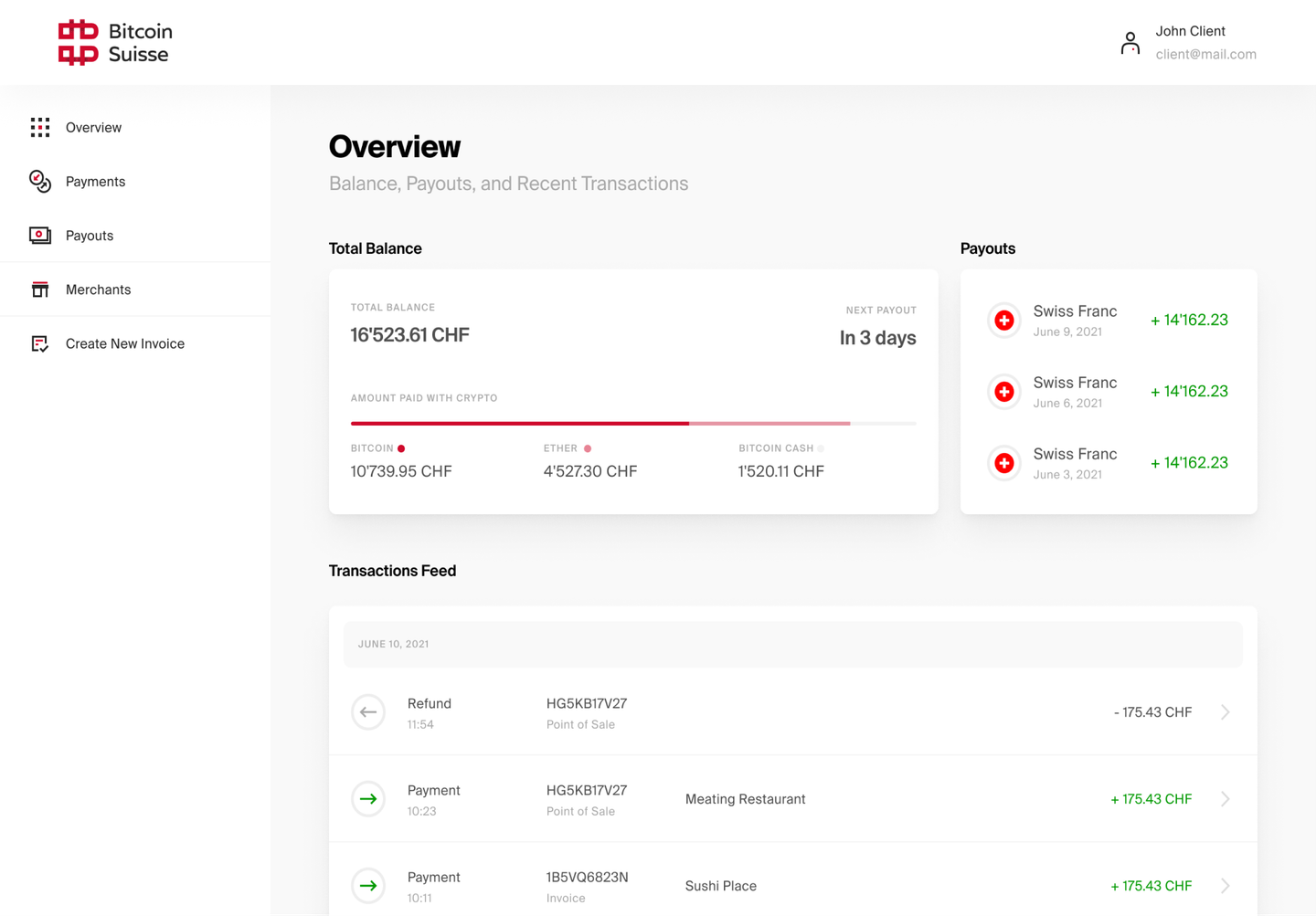 Merchant Hub is the merchant portal of Bitcoin Suisse Pay which offers an overview of all crypto transactions. Using the filter functions you can easily access the desired information such as the amount of a transaction, date and time as well as the status of the payout.