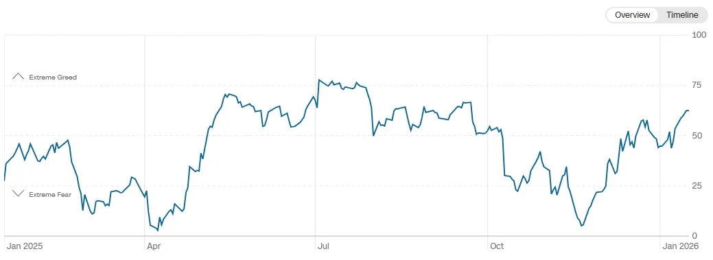 Der Crypto Fear & Greed Index lag gestern noch im gierigen Bereich (61), ist heute jedoch wieder auf ein neutrales Niveau von 49 zurückgekehrt, deutlich über dem Angstniveau der Vorwoche. Der CNN Fear & Greed Index für den Aktienmarkt verharrt hingegen weiterhin im gierigen Bereich (62) und setzt damit seinen Aufwärtstrend fort, der bereits Anfang November eingesetzt hat.