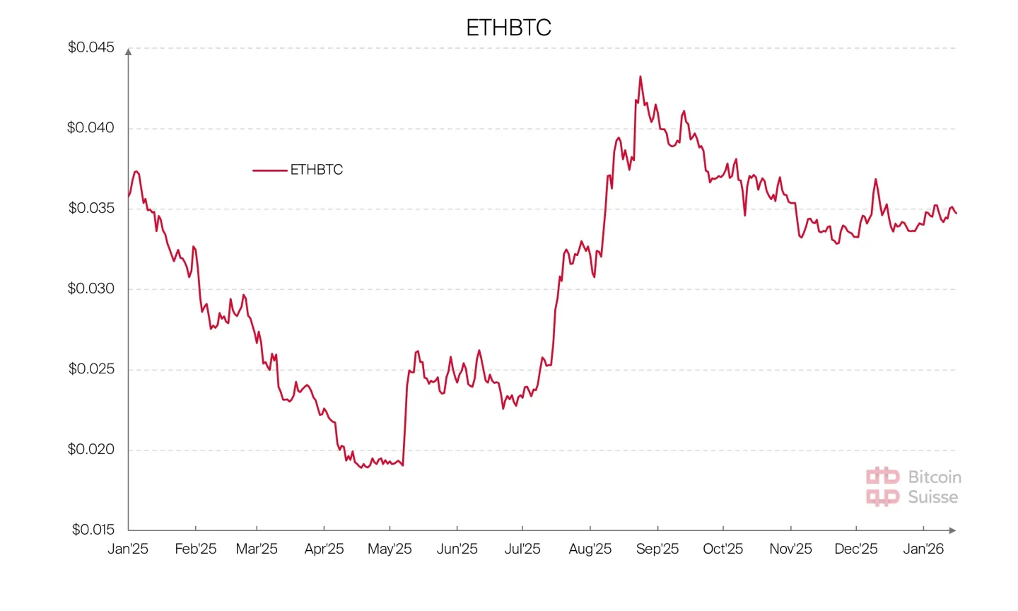Bitcoin wird aktuell bei 95’600 US-Dollar gehandelt, Ethereum notiert über 3’300 US-Dollar und Solana liegt bei 143 US-Dollar. Die gesamte Marktkapitalisierung des Kryptosektors erreichte in dieser Woche den höchsten Stand seit November 2025. Die Bitcoin-Dominanz legte im Wochenverlauf um 1 Prozent zu, während die Ethereum- Dominanz sogar einen Anstieg von fast 3 Prozent verzeichnete, was ETH in eine interessante Ausgangslage gegenüber Bitcoin bringt. Das ETHBTC-Verhältnis bewegt sich seit Anfang November kontinuierlich nach oben.