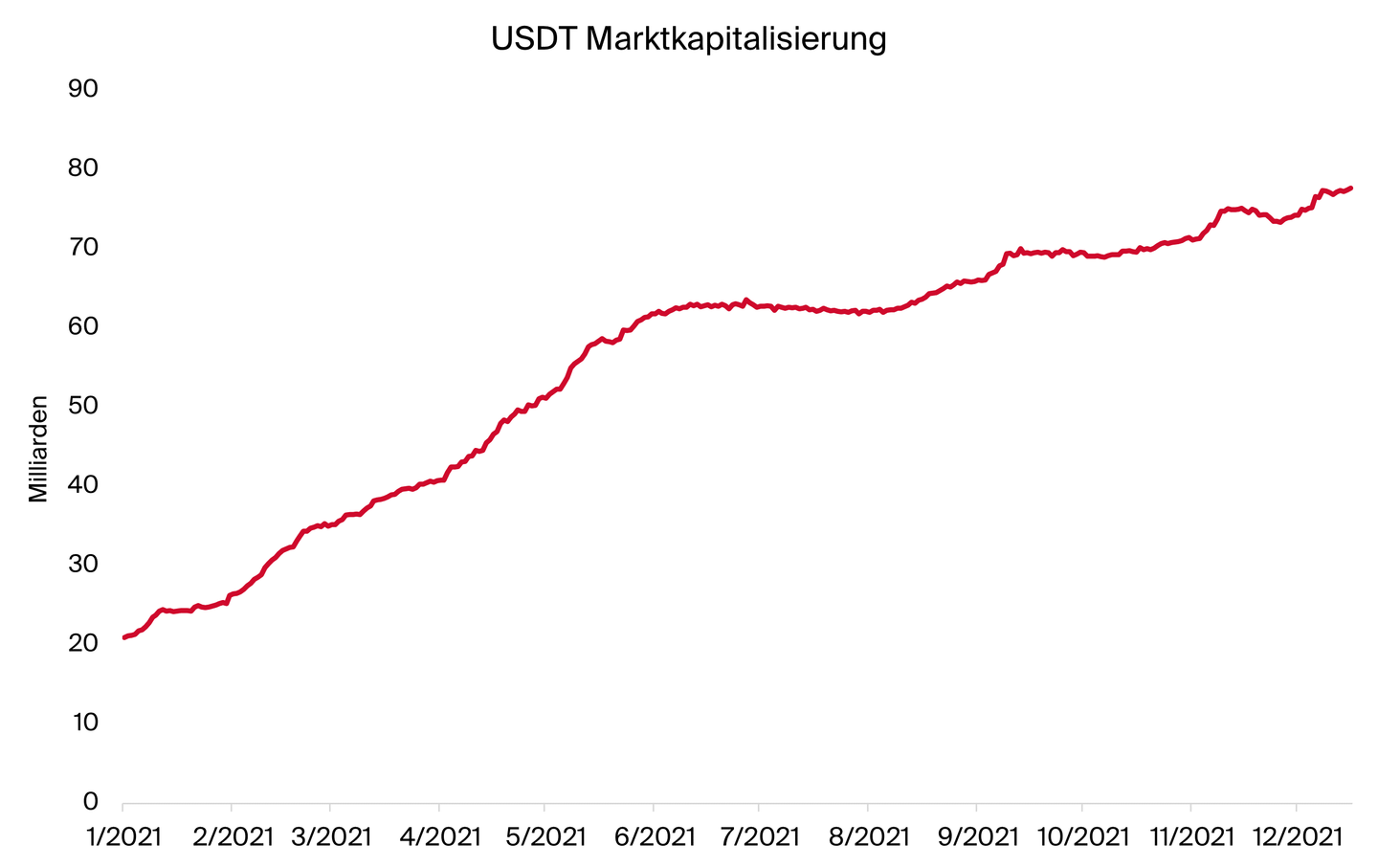 - Das Rätselraten darüber, wie viele USDT tatsächlich durch den US-Dollar gedeckt sind, geht weiter. Im vergangenen Jahr hat sich das Angebot von 20 Milliarden Dollar auf fast 80 Milliarden Dollar vervierfacht.