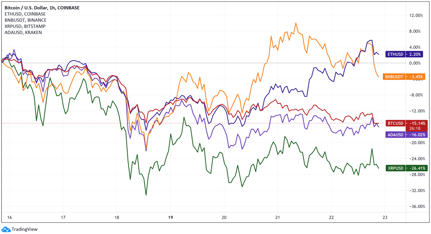 - Die Korrelationen während des Rückgangs waren allgemein hoch, und viele andere Kryptowährungen fielen in ähnlichem Ausmass.