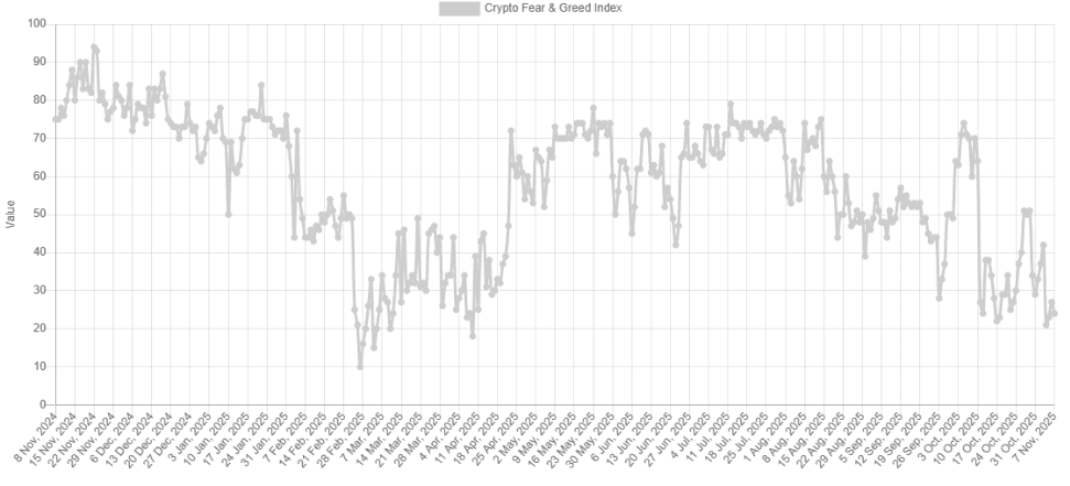 In der untenstehenden Grafik ist ein stetiger Abwärtstrend der Marktstimmung im Kryptobereich seit dem Sommer erkennbar, nachdem die Stimmung zuvor über längere Zeit im «Greed»-Bereich stagnierte. Das Sentiment hat den Kursbewegungen eng gefolgt, und da impulsive Aufwärtsbewegungen zuletzt ausblieben, spiegelt sich diese Zurückhaltung auch deutlich im Sentiment-Index wider.