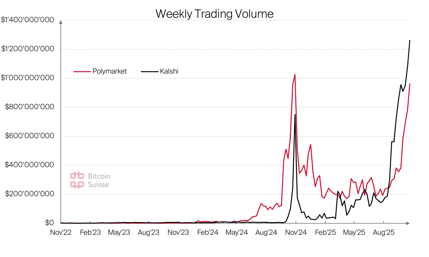 Auch Coinbase wird voraussichtlich noch vor Jahresende einen eigenen Prediction Markets lancieren, und die Zahlen von Polymarket und Kalshi steigen nach wie vor steil an. Das wöchentliche Handelsvolumen auf Prediction Markets erreichte in der vergangenen Woche zum 13. Mal in Folge ein neues Allzeithoch und überstieg 2,2 Milliarden US-Dollar, deutlich mehr als das bisherige Rekordniveau aus dem November letzten Jahres während der US-Wahlen.