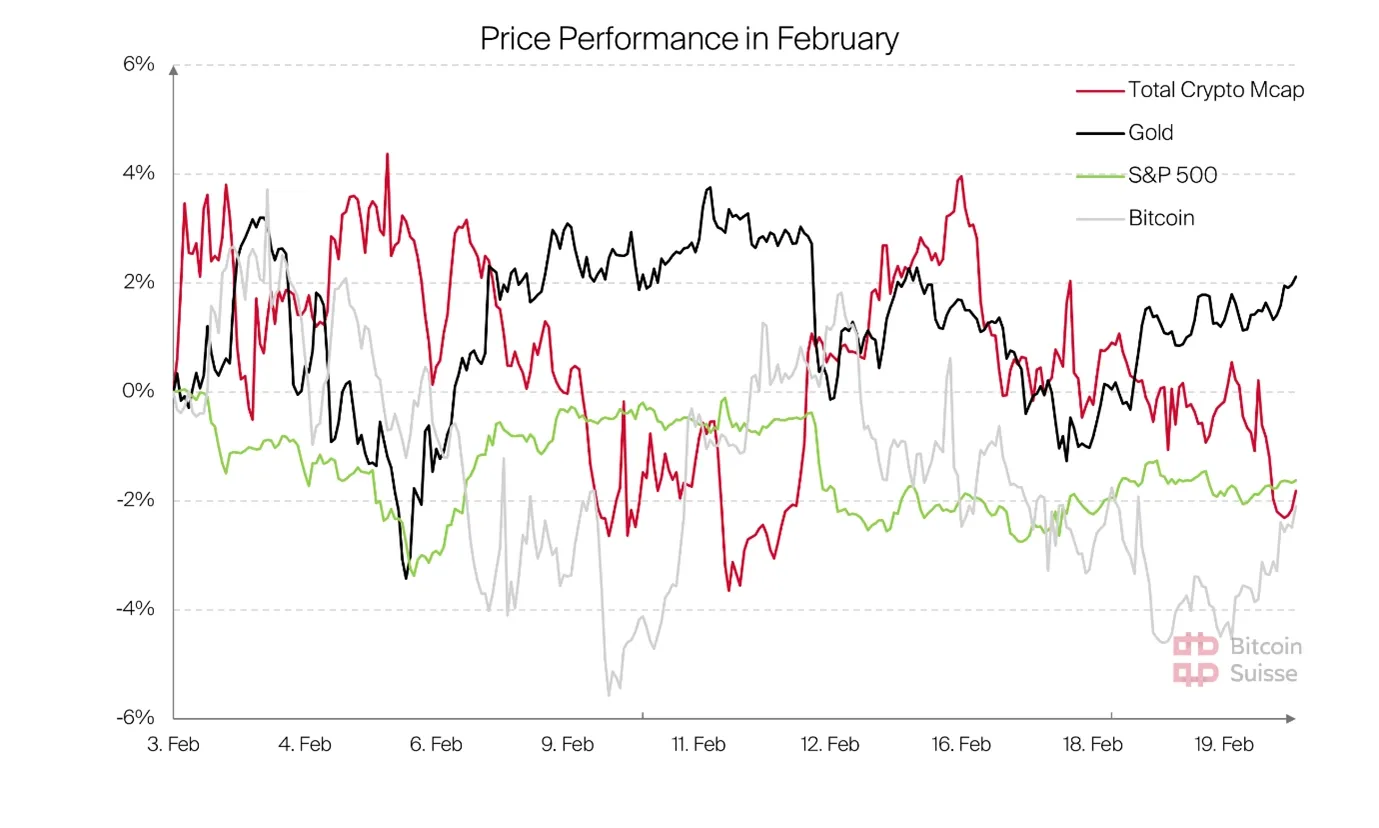 In dieser Woche werfen wir einen vertieften Blick auf die Wertentwicklung von Bitcoin, der gesamten Kryptomarktkapitalisierung, Gold sowie des S&P 500 im Monat Februar. Gold ist derzeit die einzige der betrachteten Anlageklassen, die seit Monatsbeginn im Plus notiert.