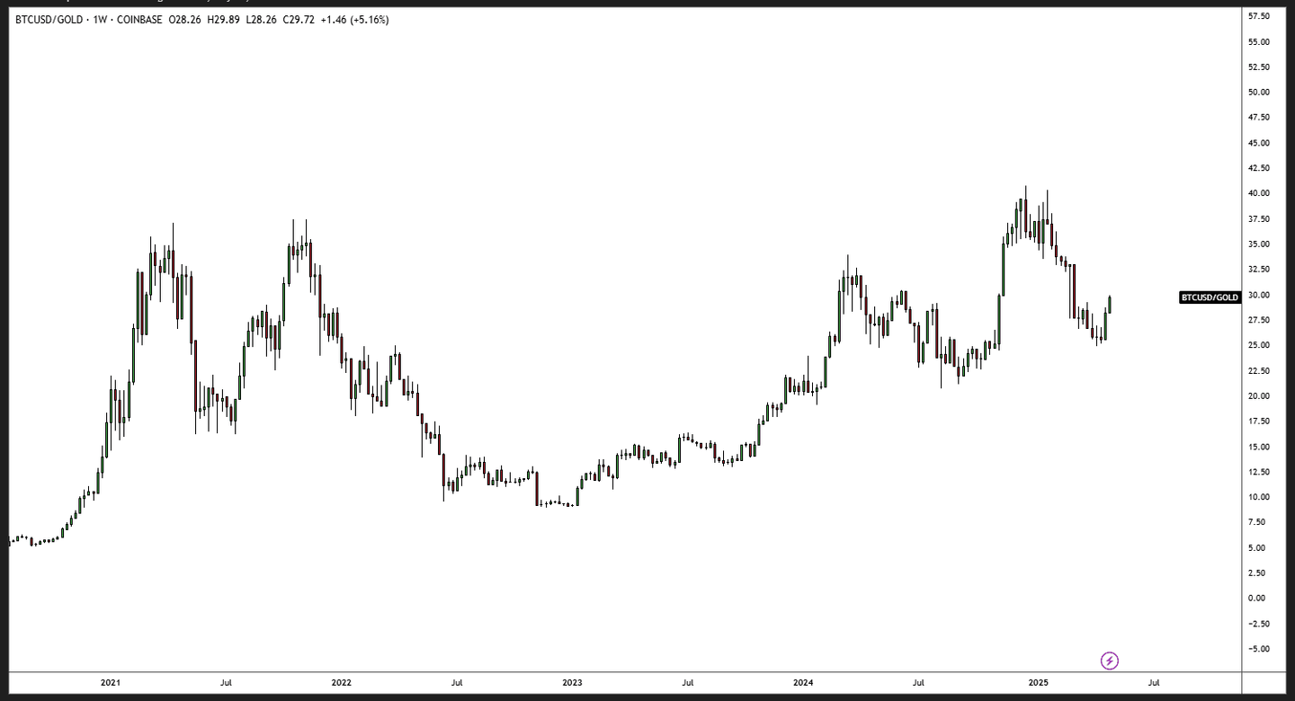 Der Gold-Chart zeigt aktuell gewisse Zeichen einer (vorübergehenden?) Überhitzung und der Bitcoin-zu-Gold-Chart weist auf eine Möglichkeit des Aufholens für Bitcoin hin – insbesondere falls sich die US-Regierung entschliessen sollte, im Rahmen budgetneutraler Strategien weitere Bitcoin zu kaufen. Eine solche Entwicklung könnte den Trend zugunsten von Bitcoin weiter beschleunigen – insbesondere dann, wenn eine Trump-Administration beschliessen sollte, Gold zu verkaufen, um stattdessen Bitcoin zu kaufen – ein Thema, das bereits diskutiert wurde.