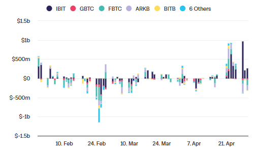 Auch diese Woche begann stark – insbesondere bei den in den USA gehandelten Spot-Bitcoin-ETFs, die bislang über 1.1 Milliarden US-Dollar an neuen Mitteln eingesammelt haben. Ethereum verzeichnete im gleichen Zeitraum bescheidene Nettozuflüsse von rund 90 Millionen US-Dollar.