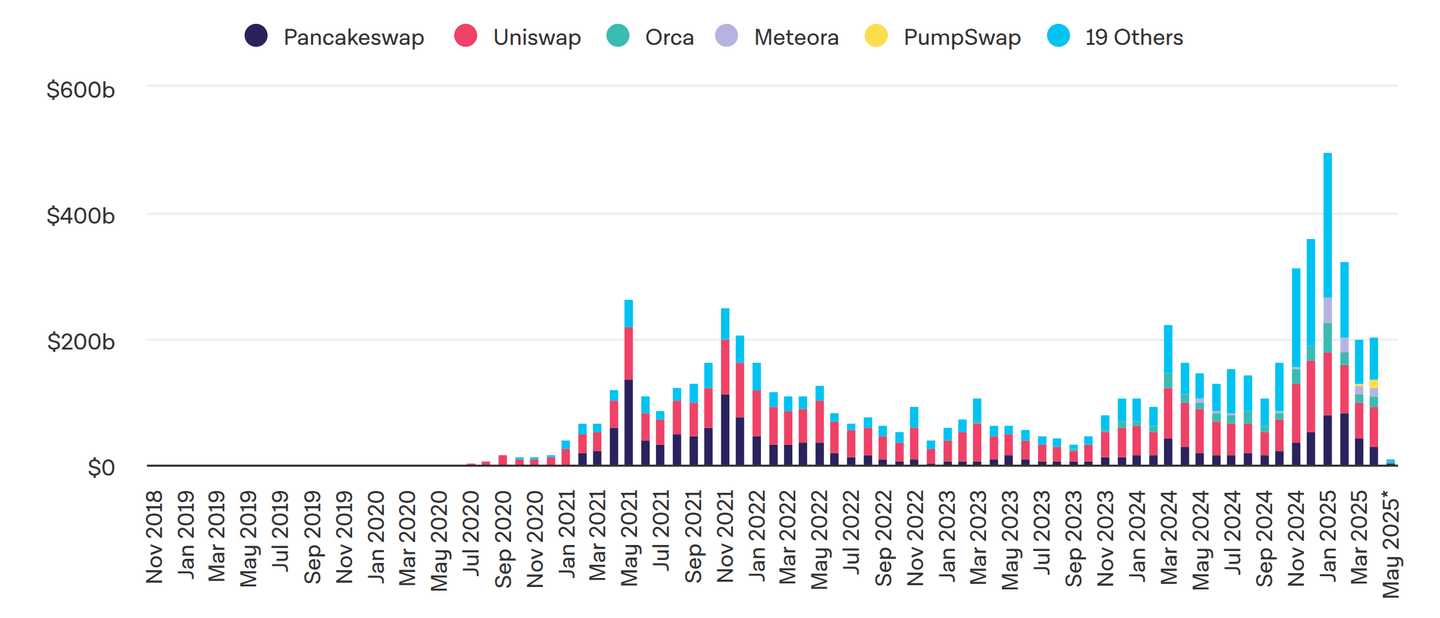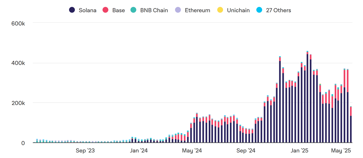 Diese Dynamik unterstreicht zwar den Rückgang der gesamten Handelsaktivität in den letzten Monaten – wohl bedingt durch makroökonomische Rahmenbedingungen wie den Zollkonflikt und das allgemeine Marktumfeld – zeigt aber gleichzeitig auch die Widerstandsfähigkeit vieler Marktteilnehmender, die trotz negativer Stimmung weiterhin neue Tokens lancieren.