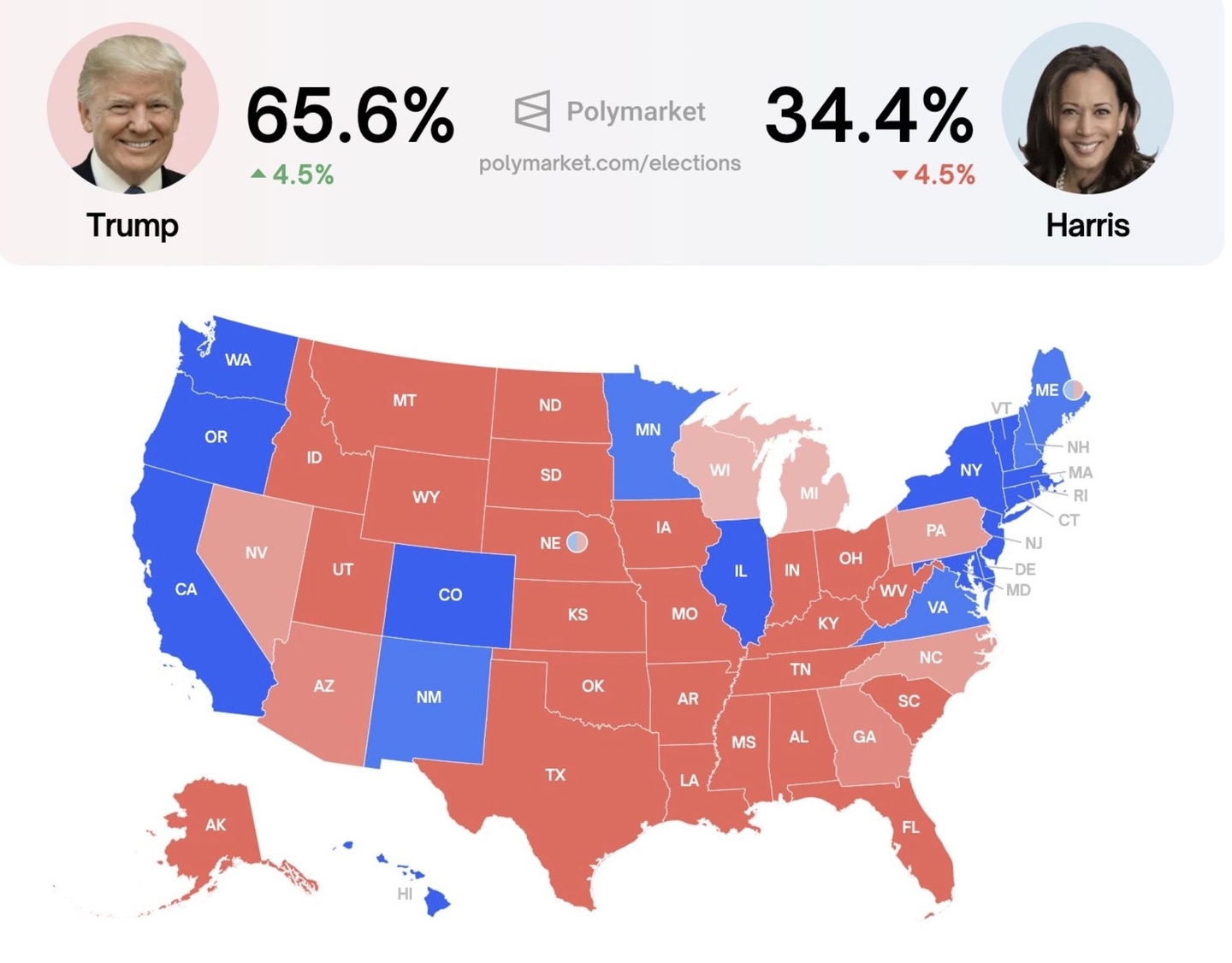 Betrachtet man das tatsächliche Wahlergebnis, wird deutlich, dass Polymarket jeden einzelnen Staat korrekt vorhergesagt hat, wie in der Karte unten dargestellt. Polymarket wurde in den letzten Monaten häufig in den Mainstream-Medien erwähnt, wobei die meisten Berichte darauf hindeuteten, dass es wahrscheinlich kein repräsentatives Bild der tatsächlichen Ereignisse liefert, da die Polymarket-Nutzer relativ homogen sind. Jüngste Daten zeigen jedoch, dass dies nicht der Fall war, da die Polymarket-Nutzer die Wahlergebnisse mit hoher Genauigkeit vorhergesagt haben.