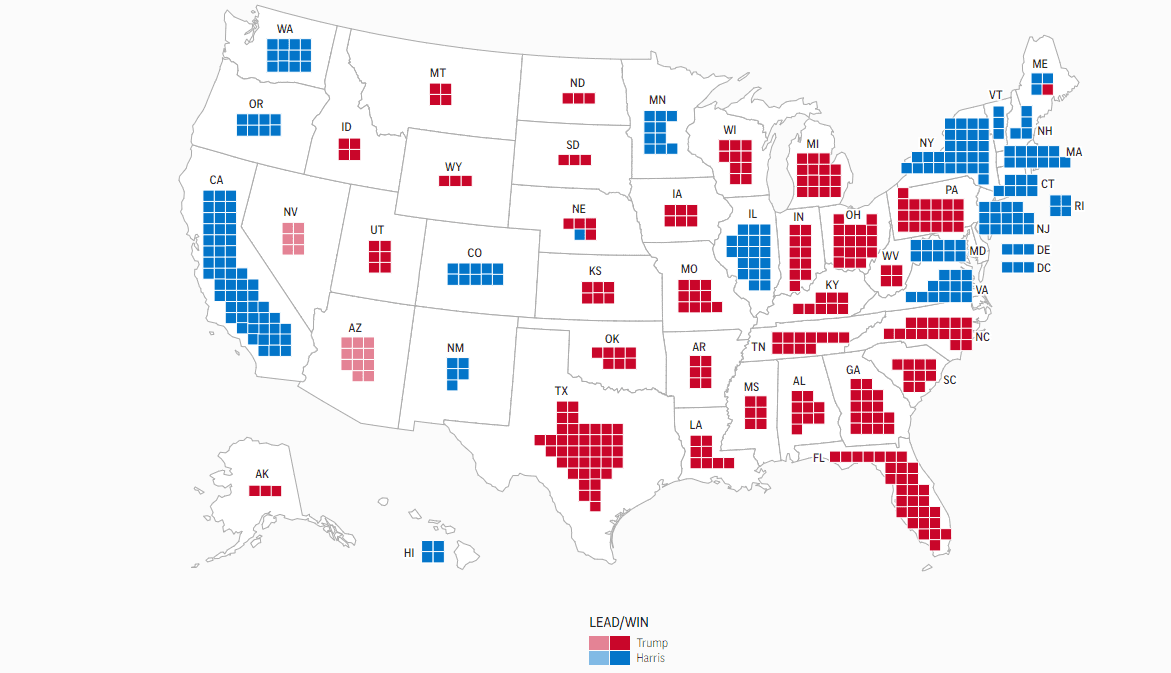 - Donald Trump wurde am Mittwoch offiziell zum 47. Präsidenten der Vereinigten Staaten erklärt, wie Associated Press berichtet. Trump hat bisher alle Swing States gewonnen, wobei Nevada und Arizona zum Zeitpunkt der Erstellung dieses Artikels noch ausstehen. Es wird erwartet, dass Trump auch diese beiden Staaten gewinnt, wodurch seine Anzahl an Wahlmännerstimmen auf über 300 steigt, während Kamala Harris auf 226 kommt. Trump hat auch die Popularitätswahl gewonnen.