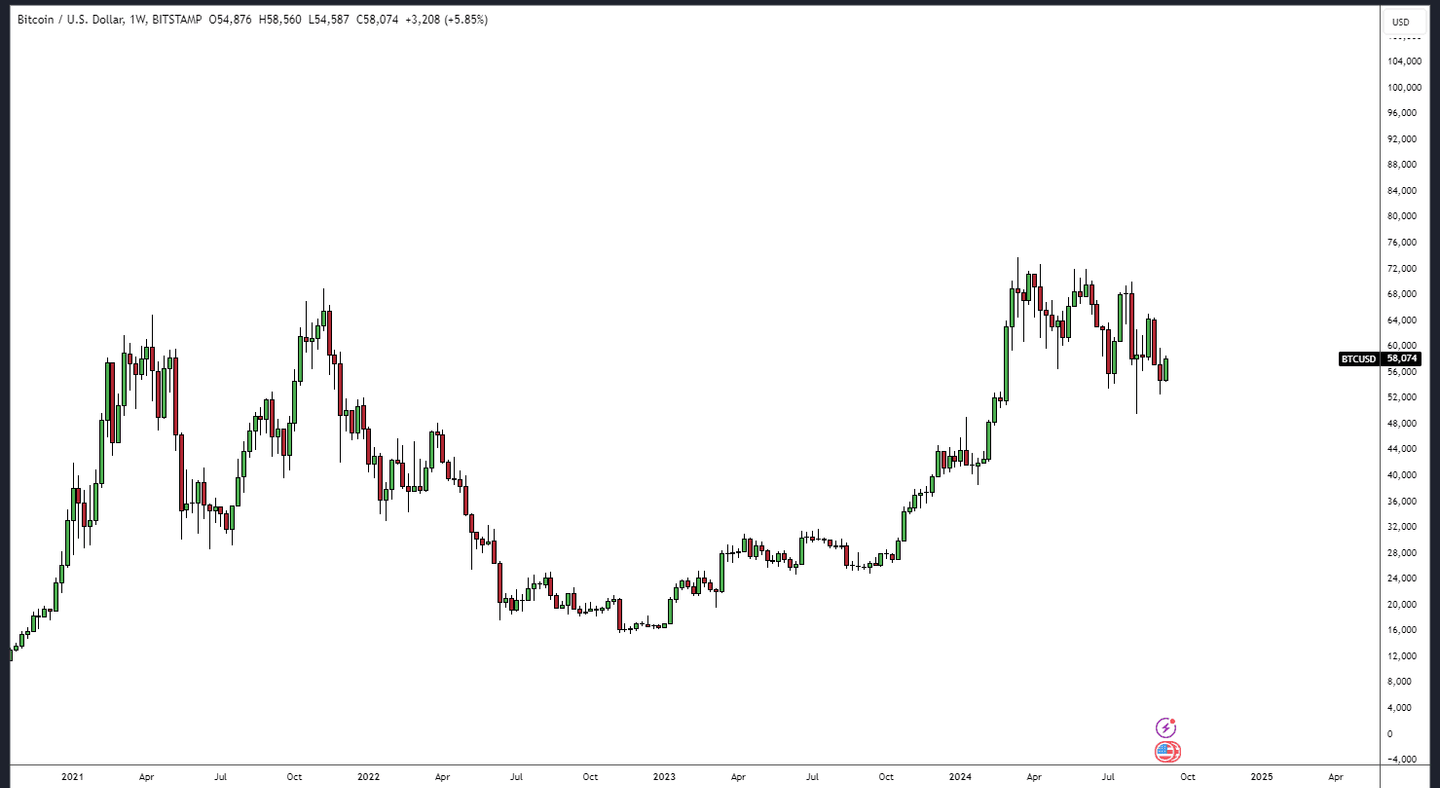 Ist Ihnen beim Betrachten der obigen Grafik etwas aufgefallen? Die Grafik zeigt die Preisentwicklung von Gold im monatlichen Zeitrahmen, während die Grafik unten Bitcoin im wöchentlichen Zeitrahmen zeigt. Wir erinnern uns an die Stimmung gegenüber Gold im Oktober 2022, als es knapp über 1'600 US-Dollar gehandelt wurde und gerade ein neues Mehrjahrestief erreicht hatte, indem es mit sieben roten Wochenkerzen aus seiner bisherigen Preisspanne nach unten ausbrach. Die Stimmung war schlecht, und der eine oder andere hatte wohl die Hoffnung verloren und verkauft, oder? Nun, Gold wurde seitdem „nur“ nach oben gehandelt und hat seit seinen Tiefstständen im Oktober 2022 um 60 Prozent zugelegt.