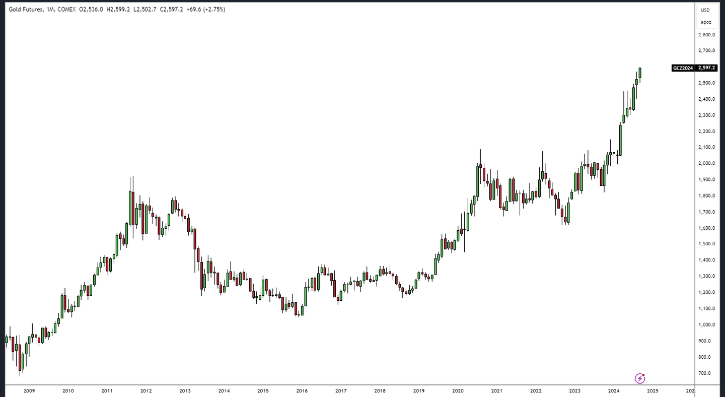 Letzte Woche haben wir uns die Preisentwicklung von Bitcoin im Vergleich zu Gold angesehen. Da Gold gerade ein Allzeithoch erreicht hat, buchstäblich zum Zeitpunkt des Schreibens dieses Artikels, lassen Sie uns einen Blick auf den Goldpreis werfen. Es ist erstaunlich, dass, während die ganze Welt über KI-Aktien, Tech-Unternehmen und Kryptowährungen spricht, Gold einen Höhenflug erlebt und in aller Stille auf einem Rekordhoch gehandelt wird, wobei der Goldpreis seit Oktober letzten Jahres um mehr als 40 Prozent gestiegen ist.