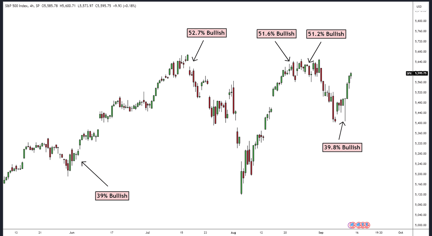 Die AAII-Mitglieder haben wieder einmal grossartige Arbeit geleistet, indem sie uns gezeigt haben, zu welchem Zeitpunkt man nicht übermässig bullish oder bearish werden sollte. Wie Sie sich wahrscheinlich erinnern, waren die Mitglieder Ende August sehr optimistisch für den Aktienmarkt, als wir nahe an den Allzeithochs notierten. In der nachstehenden Grafik sehen Sie die beiden einzigen Momente in den letzten Monaten, in denen mehr als 50 Prozent der AAII-Mitglieder antworteten, sie seien optimistisch für den Aktienmarkt, und die beiden Momente, in denen weniger als 40 Prozent der Mitglieder optimistisch für den Aktienmarkt waren. Interessant, nicht wahr?