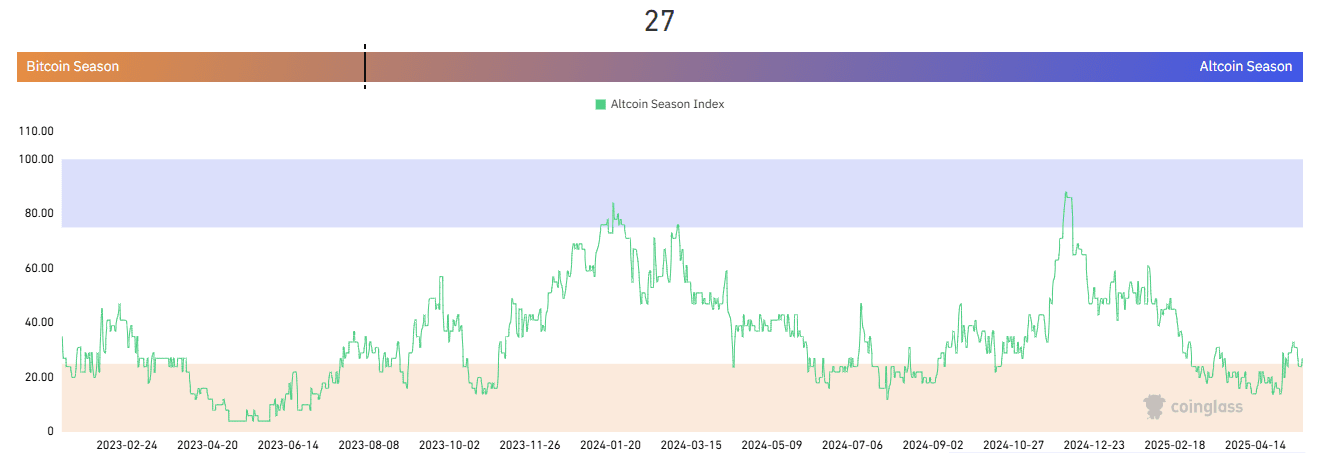 Die untenstehende Grafik zeigt, dass wir kürzlich den Bereich der «Bitcoin Season» verlassen haben und uns allmählich in Richtung «Altseason»-Zone bewegen. Allerdings befinden wir uns weiterhin deutlich näher am «Bitcoin Season»-Bereich. Altcoin-Investoren sollten ihre Erwartungen daher vorerst zügeln.