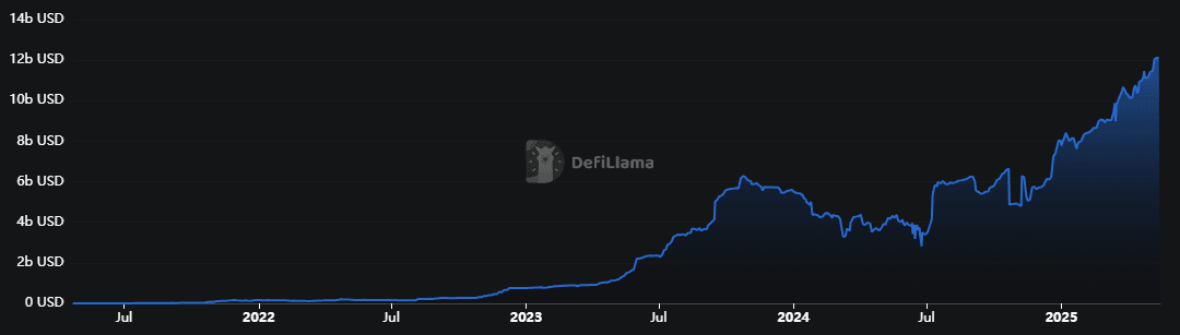 Wie die untenstehende Grafik zeigt, hat der Total Value Locked (TVL) in Real-World Assets (RWAs) über sämtliche Blockchains hinweg die Marke von 12 Milliarden US-Dollar überschritten. Diese Vermögenswerte sind auf über 80 dezentrale Finanzplattformen verteilt. Gleichzeitig verwaltet BlackRocks BUIDL-Fonds mittlerweile knapp 3 Milliarden US-Dollar, ein Anstieg von rund 19 Prozent im Monatsvergleich. Institutionelle Anleger zeigen damit zunehmendes Interesse, Kapital in tokenisierte Staatsanleihen umzuschichten.