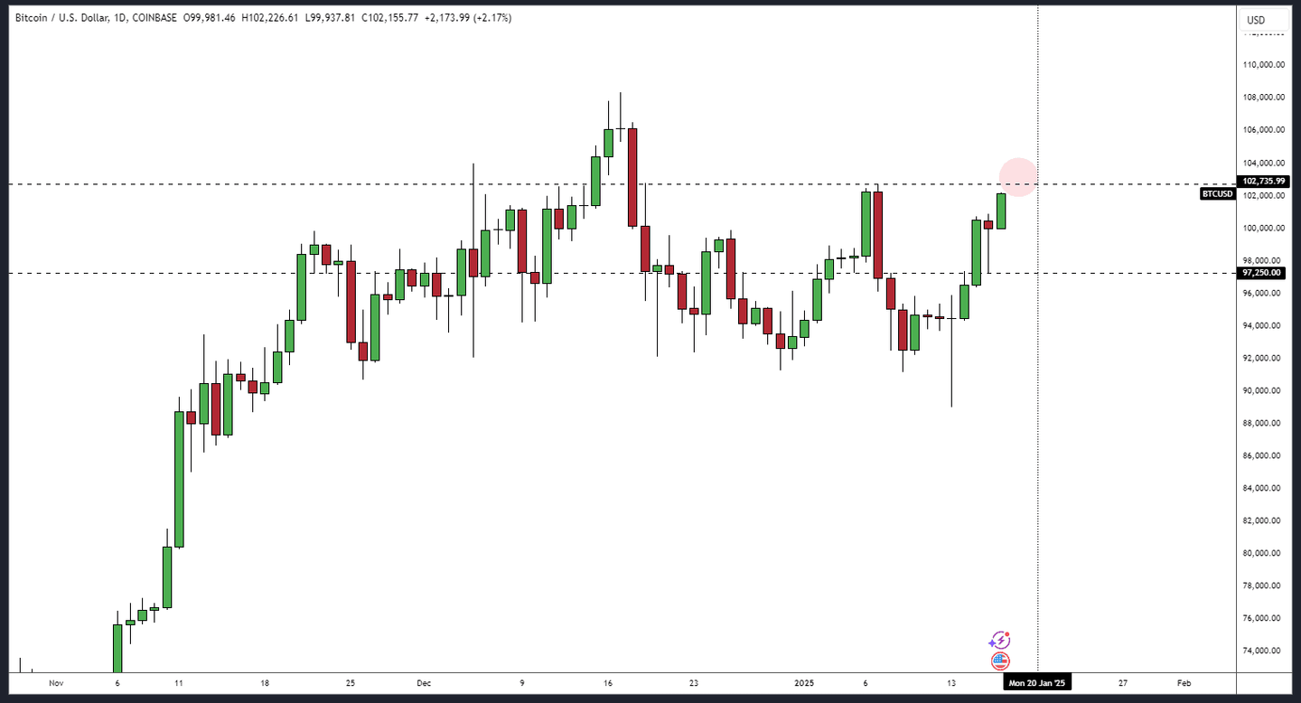 Wie die Grafik unten zeigt, hat Bitcoin am Montag einen neuen Tiefpunkt erreicht und das Tief vom 30. Dezember durchbrochen. Die Frage ist nun, ob er einen höheren Kurs als den Hochpunkt vom 7. Januar (102'735 US-Dollar) erreichen kann - ein positives Signal für die Marktstruktur - oder ob die Amtseinführung enttäuschend verläuft und zu einem „Sell the News“-Ereignis wird.