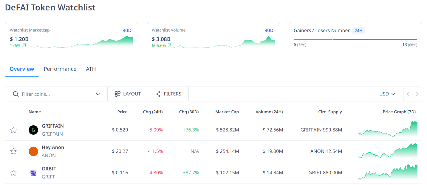 Zu den führenden Projekten im DeFAI-Bereich gehören derzeit Griffain, Hey Anon und Orbit. Griffain führt das Feld mit einer Marktkapitalisierung von rund 500 Millionen US-Dollar an, gefolgt von Hey Anon mit 250 Millionen US-Dollar und Orbit mit 100 Millionen US-Dollar.