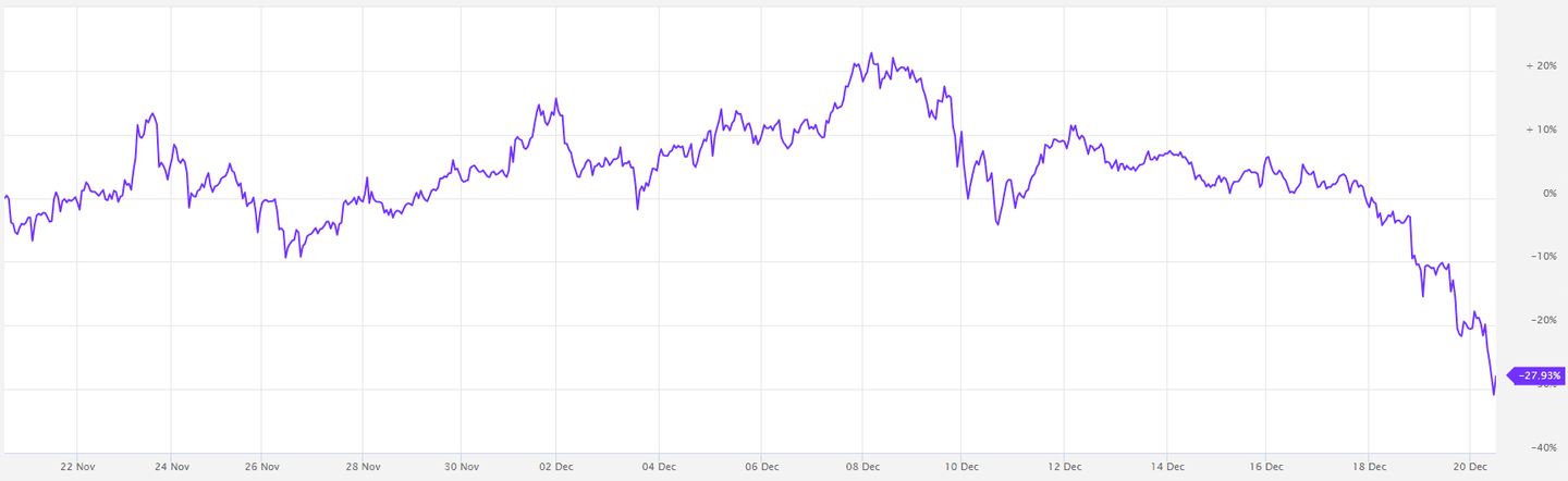 WIF liegt 61 Prozent unter seinem November-Hoch, PEPE 45 Prozent unter seinem Dezember-Hoch, und selbst Dogecoin liegt 41 Prozent unter seinem Hoch vom 8. Dezember, das erst ein paar Wochen zurückliegt.