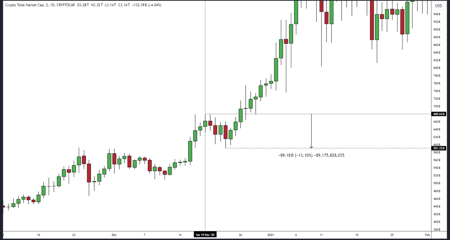Ein Blick zurück in den Dezember 2020 zeigt, dass die gesamte Marktkapitalisierung kurz vor Weihnachten eine Korrektur von 13 Prozent erlebte, wie in der folgenden Grafik dargestellt. Die Geschichte zeigt, dass solche Korrekturen ganz normal sind, selbst in bullischen Märkten. Nach dem Dezember 2020 erlebte die gesamte Krypto-Marktkapitalisierung in den folgenden Monaten einen starken Anstieg der Bewertung. Die Geschichte wiederholt sich zwar nicht, aber es ist wichtig, solche Bewegungen in die richtige Perspektive zu rücken, und ein Blick in die Vergangenheit kann dabei sicherlich helfen.