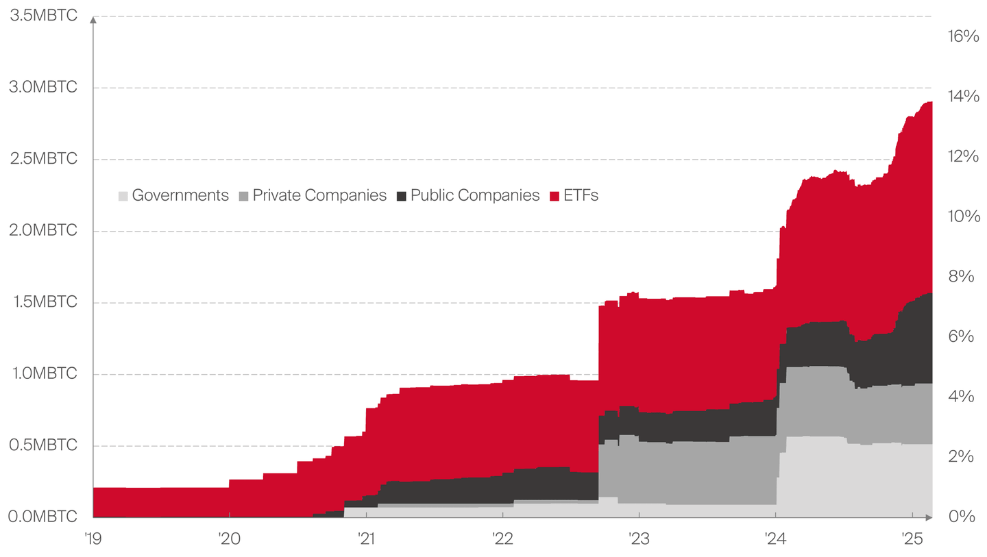 Diese Woche möchten wir unser On-Chain-Diagramm des Monats aus unserem neuesten Industry Rollup-Bericht hervorheben. In dem Bericht haben wir die Akkumulation von BTC durch Unternehmen, Institutionen und Staaten im vergangenen Jahr genauer untersucht und festgestellt, dass sich Ende Februar etwa 14 Prozent des Bitcoin-Angebots in ETFs, Unternehmensbilanzen und staatlichen Wallets befanden. Im vergangenen Jahr haben mehr als eine halbe Million BTC ihren Weg in US-amerikanische Spot-ETFs gefunden. Auch börsennotierte Unternehmen sind auf Einkaufstour, angeführt von Michael Saylor und Strategy; gemeinsam haben sie seit Januar 2024 mehr als 1'000 BTC pro Tag erworben, was einem Anstieg der BTC-Bestände um 80 Prozent im Jahr 2024 entspricht.