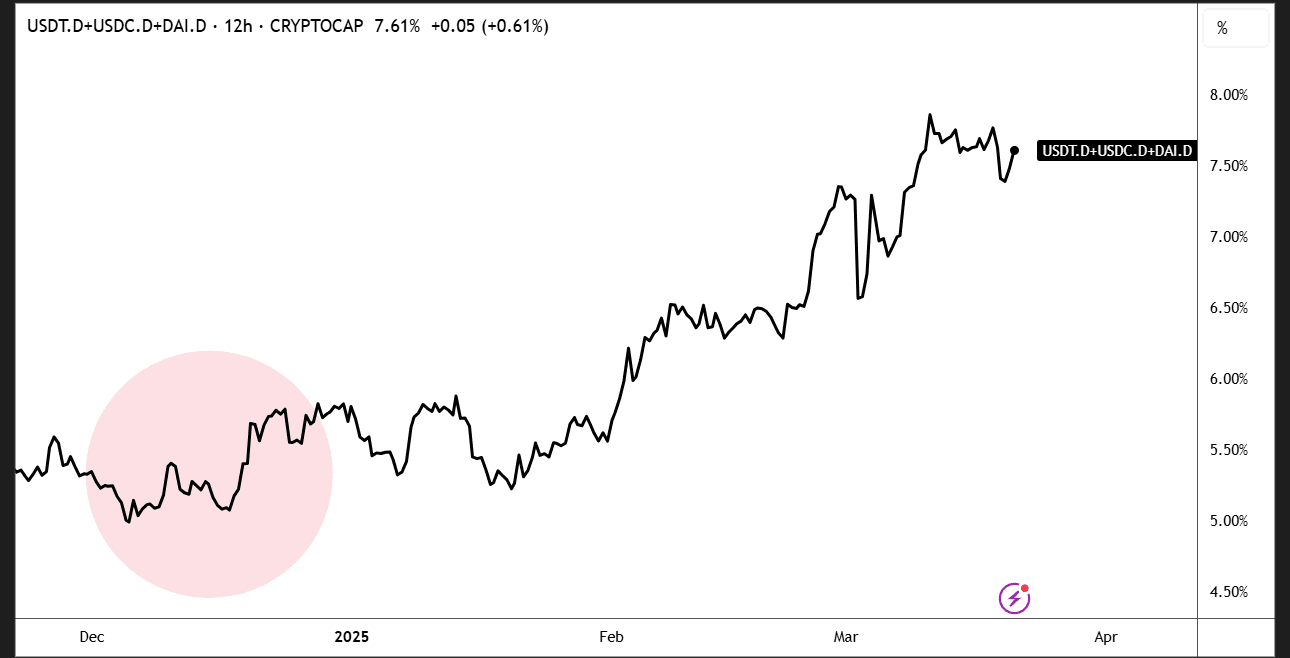 Die Dominanz der Stablecoins, in der untenstehenden Grafik durch die Stablecoins USDT, USDC und DAI dargestellt, hat sich seit Dezember letzten Jahres weiter nach oben entwickelt. Wie wir in der Grafik sehen können, hat sich der Trend der Stablecoin-Dominanz Anfang Dezember 2024 gedreht und ist seitdem stetig gestiegen. Betrachtet man jedoch die letzten Tage, so zeigt die untenstehende Grafik Anzeichen einer Abschwächung dieses Aufwärtstrends. Es könnte sich lohnen, dies weiter im Auge zu behalten.