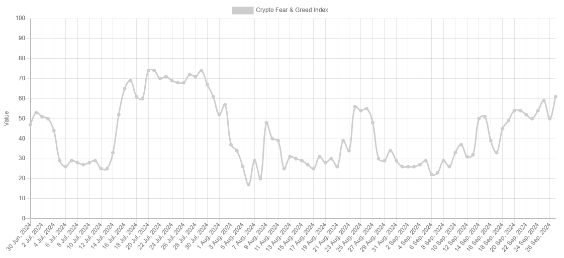 Ein Blick auf den unten aufgeführten Krypto-Angst- und -Gier-Index zeigt, dass die Stimmung für einen weiteren Aufschwung bereit ist. Der Index hat gerade ein neues Hoch erreicht, den höchsten Stand seit Anfang August.
