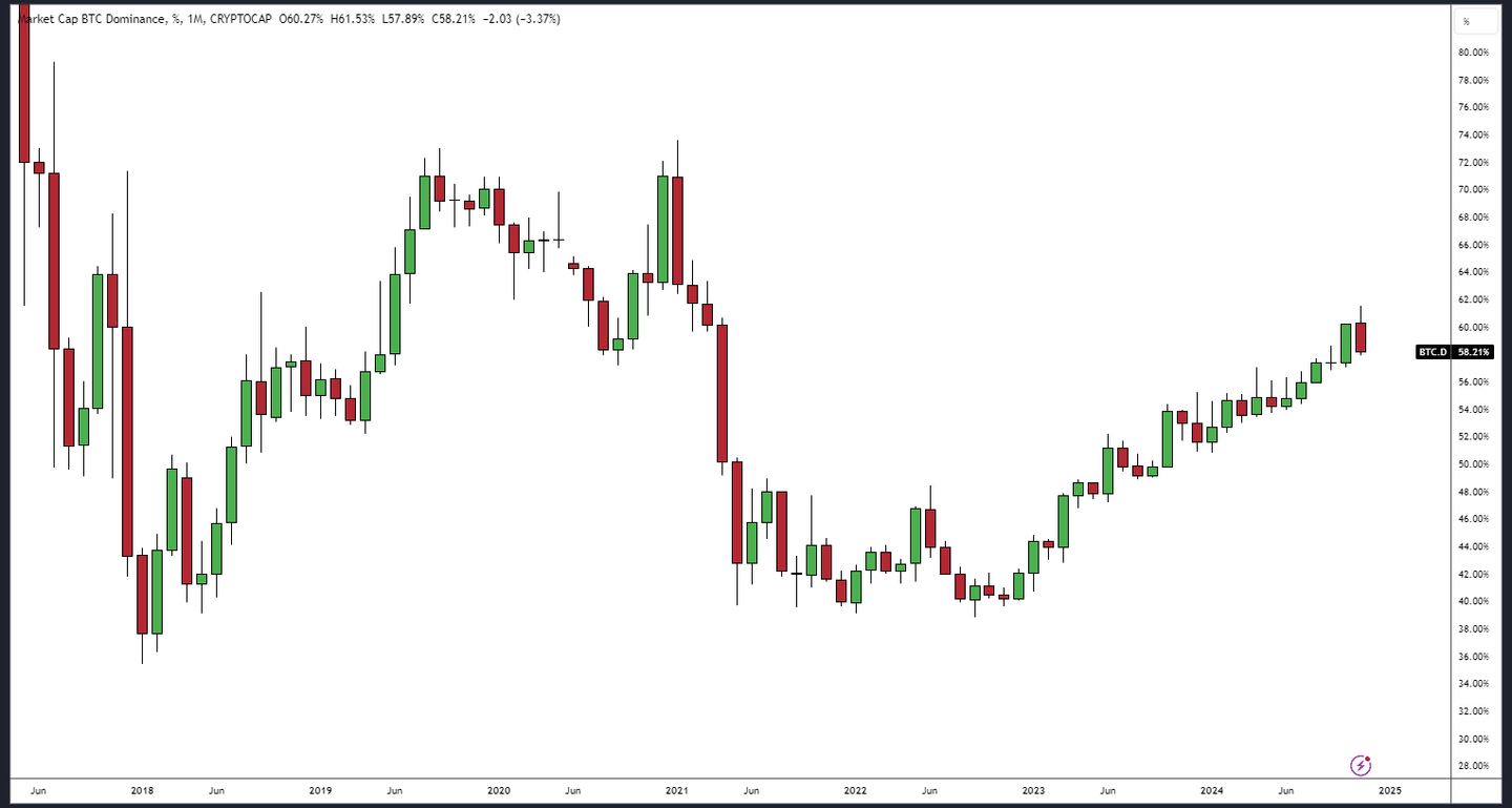 Die Bitcoin-Dominanz ist auf dem besten Weg, den Monat November mit einer roten Monatskerze abzuschliessen. Zum Zeitpunkt der Erstellung dieses Artikels ist die Bitcoin-Dominanz im Monatsverlauf um 3,4 Prozent gesunken, was den November zum Monat mit der schlechtesten Performance für die Bitcoin-Dominanz seit August 2022 machen würde, als sie um mehr als 4 Prozent sank und damit einen Tiefpunkt für die Dominanz zu diesem Zeitpunkt markierte.
