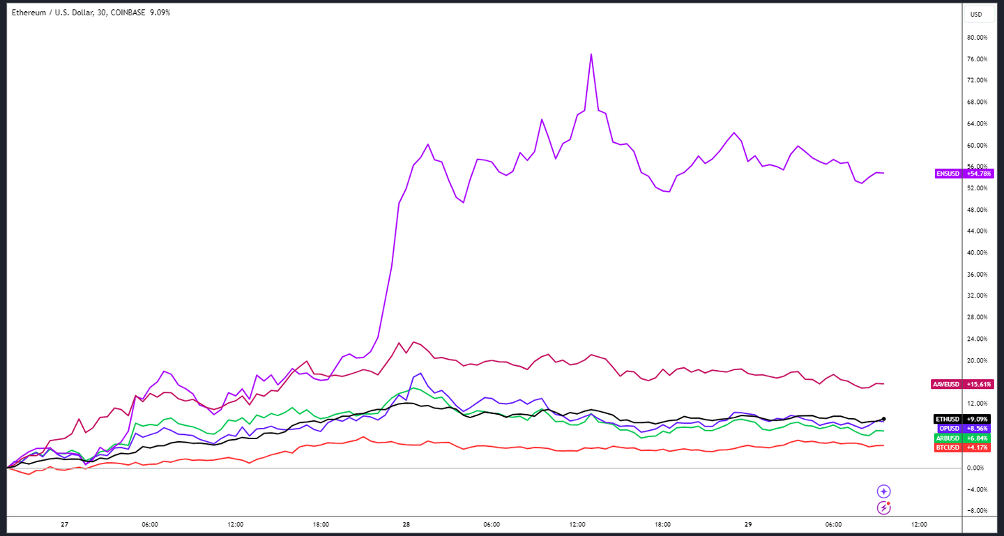 Diese Aufwärtsbewegung von ETH erstreckte sich auf verschiedene Ethereum-Beta-Coins wie AAVE, ENS, OP und ARB. Zum Zeitpunkt der Erstellung dieses Artikels haben alle genannten Coins seit Dienstagabend eine bessere Performance als BTC erzielt, wie in der folgenden Grafik ersichtlich.