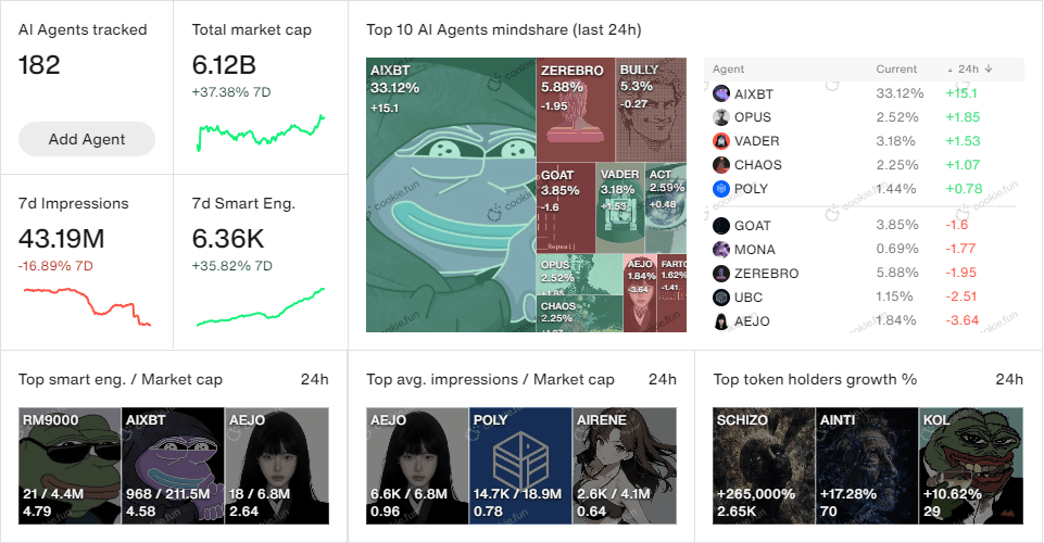 KI-Agenten haben in den letzten Tagen aussergewöhnlich gute Leistungen erbracht, wobei verschiedene KI-Agenten zu den Top-Performern der letzten 24 Stunden gehören. Wenn Sie sich für diese aufkommende Entwicklung auf dem Kryptowährungsmarkt interessieren, besuchen Sie cookie.fun, einen KI-Agenten-Index, der 182 KI-Agenten mit einer Gesamtmarktkapitalisierung von 6,12 Milliarden US-Dollar verfolgt – ein Anstieg von 37 Prozent in den letzten sieben Tagen.