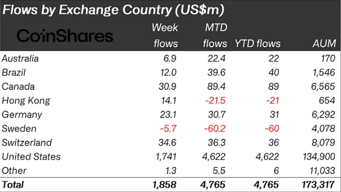 Auch in der vergangenen Woche verzeichneten Anlageprodukte für digitale Vermögenswerte mit einem Nettozufluss von insgesamt 1,9 Milliarden US-Dollar eine starke Performance. Die meisten Zuflüsse verzeichnete Bitcoin mit einem Zufluss von insgesamt 1,76 Milliarden US-Dollar in BTC-Produkte. Ethereum-Produkte verzeichneten Zuflüsse von 205 Millionen US-Dollar, während XRP mit 18,5 Millionen US-Dollar an dritter Stelle lag.