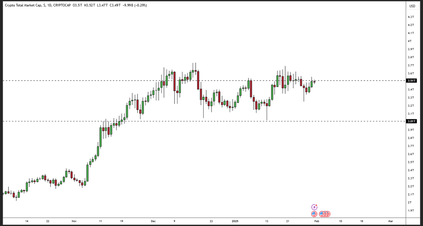 Bei Betrachtung der Gesamtmarktkapitalisierung zeigt der Chart eine Konsolidierungsphase unter dem Dezemberhoch, und die Gesamtmarktkapitalisierung kämpft derzeit mit dem Wert von 3,51 Billionen US-Dollar, bei dem die Marktkapitalisierung Anfang Januar gescheitert war, wie der folgende Chart zeigt.