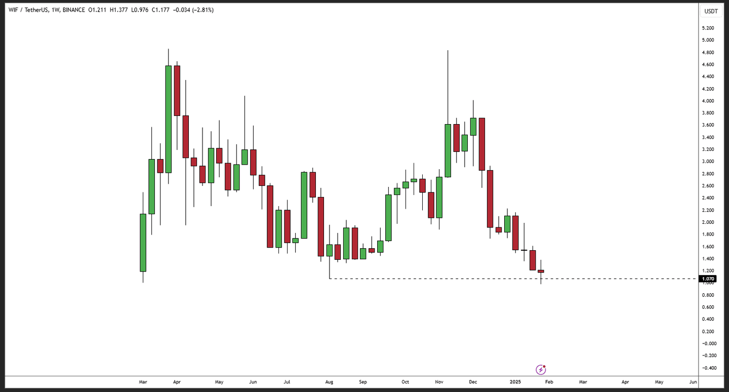 In anderen Nachrichten: Memecoins haben eine schwere Zeit... Sie erinnern sich sicherlich an Dogwifhat, oder? WIF erreichte kürzlich ein neues Mehrmonatstief und fiel unter die magische 1 US-Dollar-Marke, hat sich aber seitdem etwas erholt und notiert zum Zeitpunkt der Veröffentlichung dieses Artikels wieder über dieser psychologischen Marke. Aber WIF ist nicht der Einzige, der zu kämpfen hat – die meisten Memecoins sind in den letzten Wochen gefallen, wobei einige den Grossteil ihrer Gewinne wieder abgegeben haben und nun mehr als 80 Prozent unter ihren Höchstständen liegen.