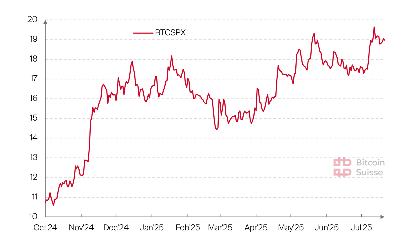 Ein Blick auf den untenstehenden Chart, der Bitcoin im Verhältnis zum S&P 500 zeigt, verdeutlicht: BTC erreichte kürzlich ein neues Allzeithoch gegenüber dem US-Aktienindex. Dieser Höchststand war jedoch nur von kurzer Dauer, weniger als einen Tag, denn Bitcoin hat seither mehr als 7 Prozent verloren (seit dem Hoch vom 14. Juli 2025).