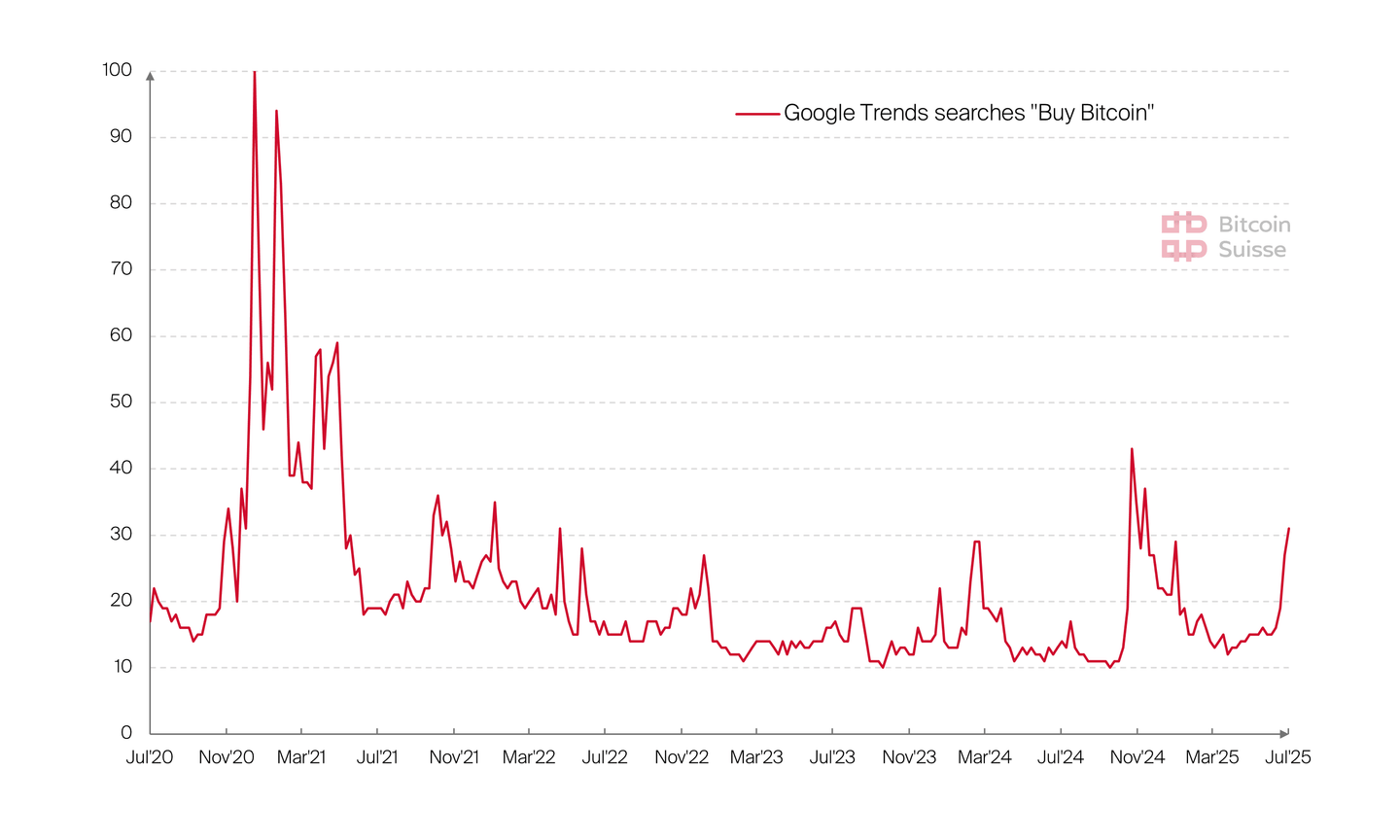 Marktteilnehmer versuchen häufig, die Stimmung im Retail-Segment einzuschätzen, um besser zu verstehen, in welcher Phase des aktuellen Zyklus sich der Kryptomarkt befinden könnte. Ein Blick auf die Google-Suchanfragen nach «Buy Bitcoin» in den vergangenen fünf Jahren zeigt, dass das Interesse aktuell wieder zunimmt. Die Suchvolumina erreichten zuletzt im November und Dezember 2024, nach den US-Wahlen, ein neues Mehrjahreshoch.