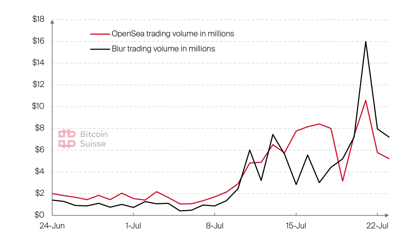 Bei den Handelsplätzen dominieren weiterhin OpenSea und Blur. Allein am Montag verzeichnete Blur ein Handelsvolumen von 15 Millionen US-Dollar, während OpenSea auf 10 Millionen kam – zusammen machten beide Plattformen somit den Grossteil des gesamten Tagesvolumens von 27 Millionen US-Dollar aus.