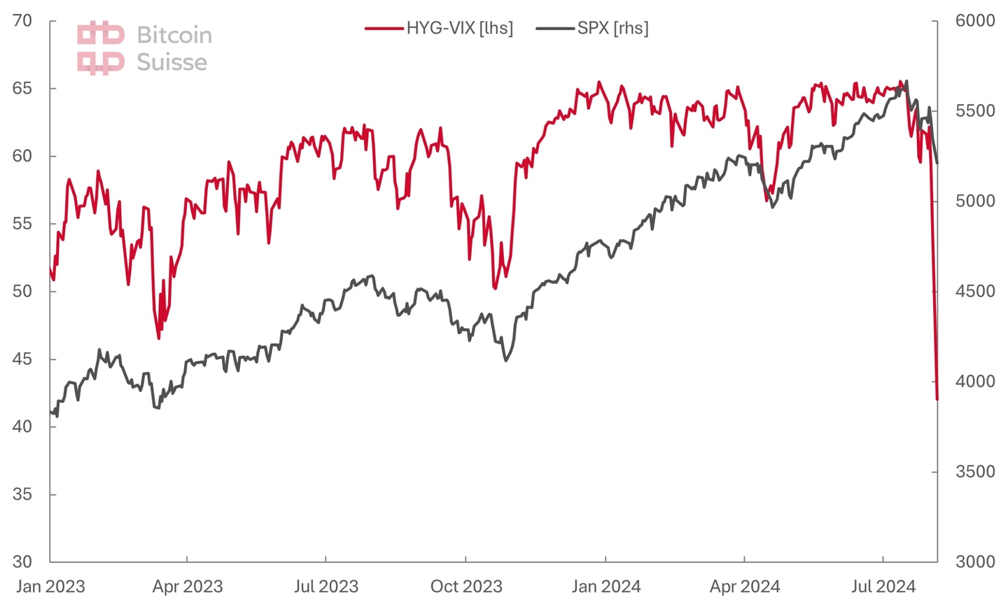 - HYG-VIX-Indikator: Der benutzerdefinierte Indikator kombiniert die Wertentwicklung hochverzinster Unternehmensanleihen (HYG) mit der Marktvolatilität (VIX) und bietet so Einblicke in die Risikostimmung. Der HYG-VIX-Indikator stürzte innerhalb des heutigen Handelstages (Montag, 5. August) um mehr als 50% ab, was auf eine deutlich erhöhte Risikostimmung und Marktinstabilität hindeutet.