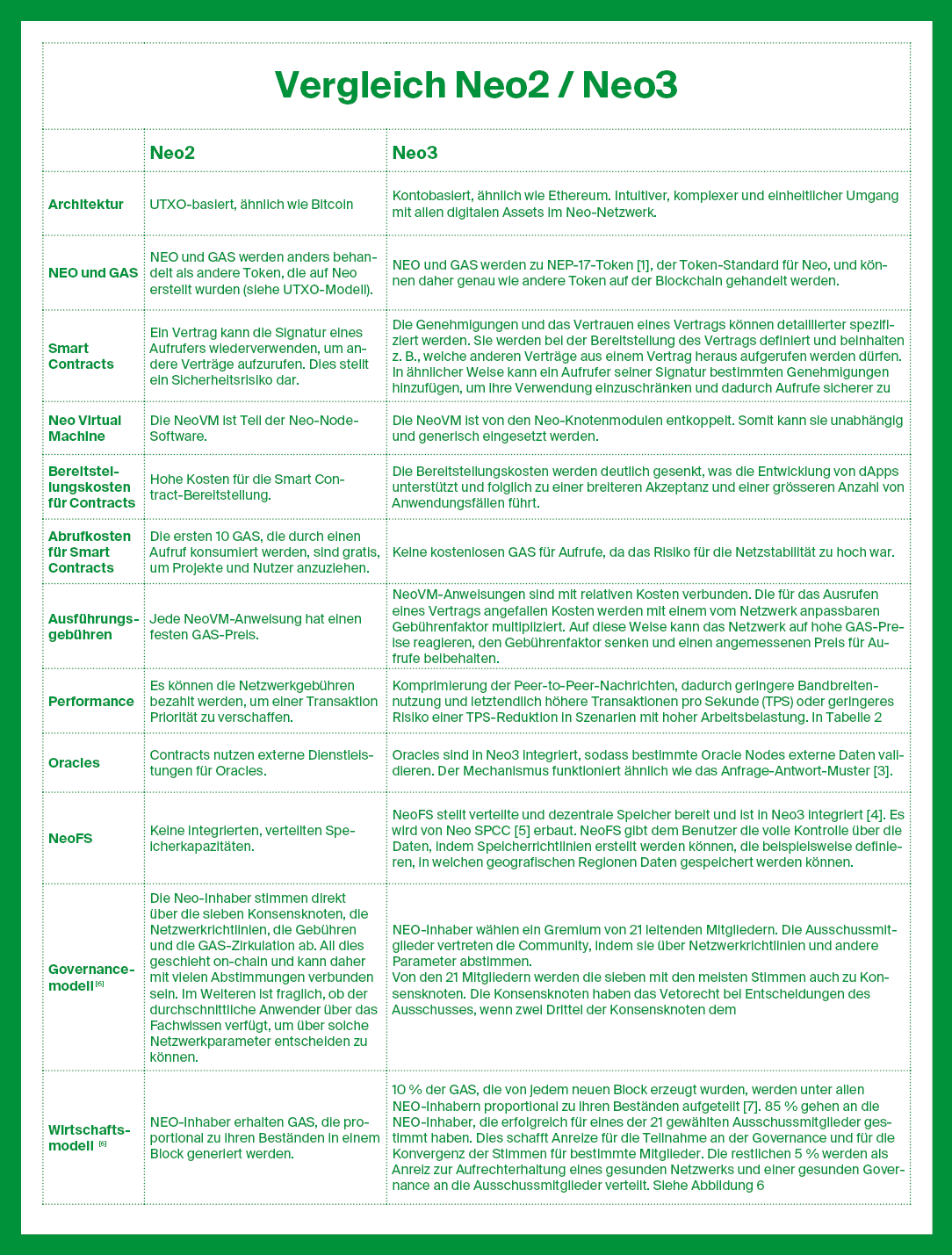 Tabelle 1 enthält eine nicht vollständige Liste der Anpassungen, die Neo3 von Neo2 unterscheiden und damit besser machen.