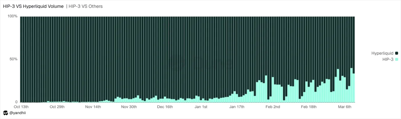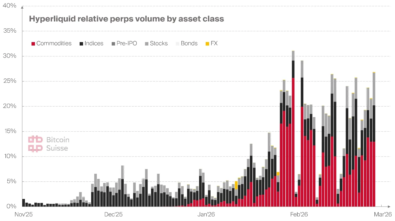 This week we want to highlight the onchain chart of the month from our March edition of the Industry Rollup report. We highlighted that the relative perpetual volumes on Hyperliquid show a clear regime shift since January, as non-crypto asset classes have been steadily gaining share, with peaks in February, when commodities alone approached ~25 percent of total perp activity.