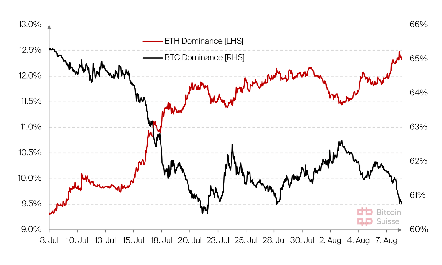 While Bitcoin dominance is losing ground, Ethereum dominance is up 36 percent since the beginning of July and currently stands at 12.4 percent. This is an interesting dynamic worth keeping in mind. While it could still be just a short “summer trend”, there is also potential that this is a real rotation with staying power.