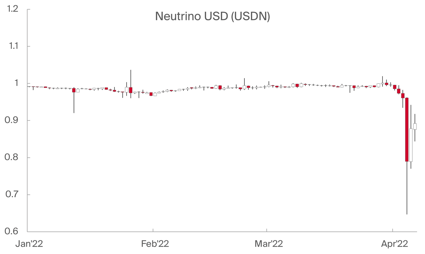 - USDN, an algorithmic stablecoin of the Waves ecosystem, started to lose its Dollar peg on April 1 and fell by more than 35% to $0.65 (KuCoin) on April 4, and as of April 8, it is trading back at $0.95, still below peg.