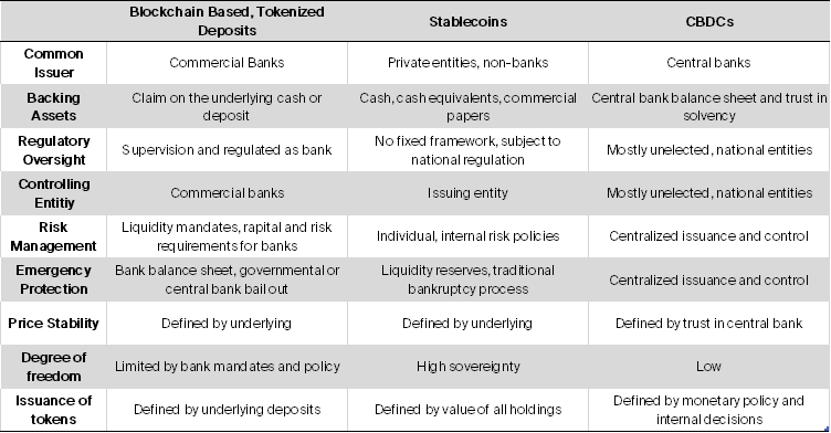 - Compared to CBDCs, which are controlled by one single centralized entity, the respective central bank, tokenized deposits are emitted by each commercial bank, being backed by the respective bank’s deposits and cash equivalents.