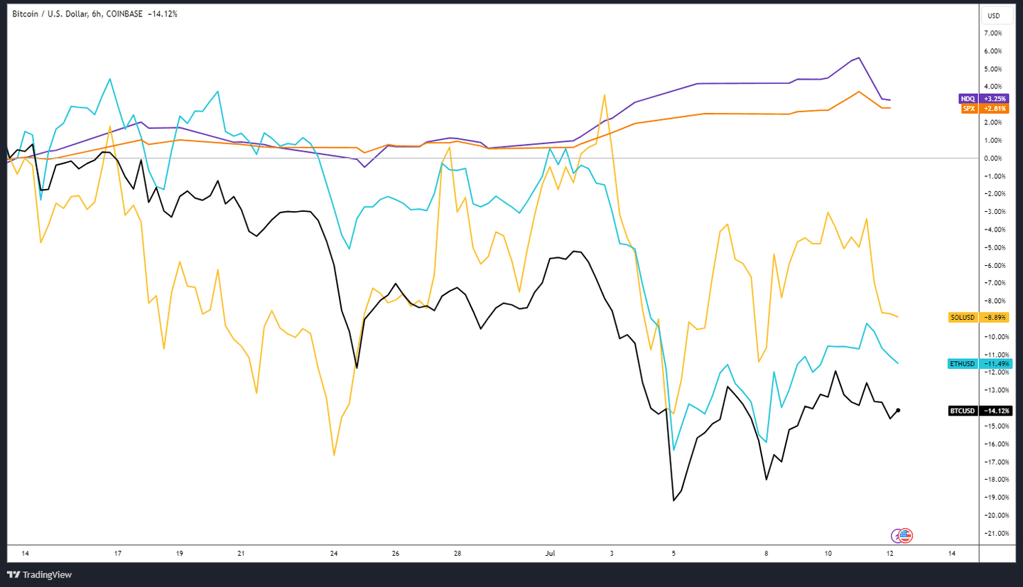 The chart shows a clear picture, U.S. equities have performed extremely well over the course of the last few weeks, while Bitcoin has corrected to the downside, being down 14% since the middle of June, while ETH is down 11% and SOL is down 8%, after a volatile month of ups and downs.