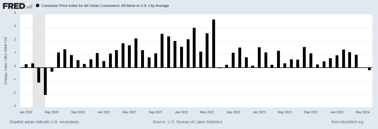 On Thursday, the U.S. CPI data revealed that the U.S. inflation had declined in June for the first time since May 2020. The CPI, a broad measure of costs for goods and services across the U.S. economy, declined 0.1% from May, putting the yearly rate at 3%, around its lowest level in more than three years. The June inflation data has had an impact on the probability of a rate cut at the September meeting. Before the CPI data, the expectation for a rate cut was roughly 70%, and at the time of writing, the market now expects a rate cut in September with a probability of 86%. In the chart below, you can see the U.S. CPI data monthly changes over the last four years, highlighting the first decline in over four years in June.