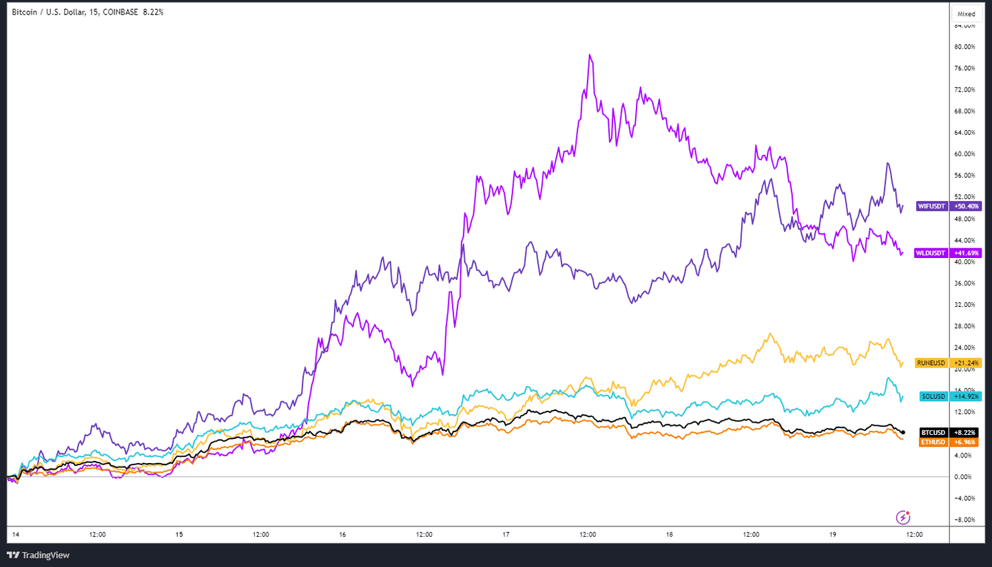 When it comes to price action across the crypto markets this week, we can observe that Bitcoin has outperformed Ethereum so far this week. Other large-cap altcoins, like Solana, are up even more, with SOL being up roughly 15% for the week. While some smaller-cap altcoins, like RUNE are outperforming the larger coins so far this week, memecoins like WIF, PEPE or POPCAT are back alive, and some of them are showing weekly performances of +50%. Another outperformer this week is WLD. Probably due to the news regarding upcoming token unlocks.