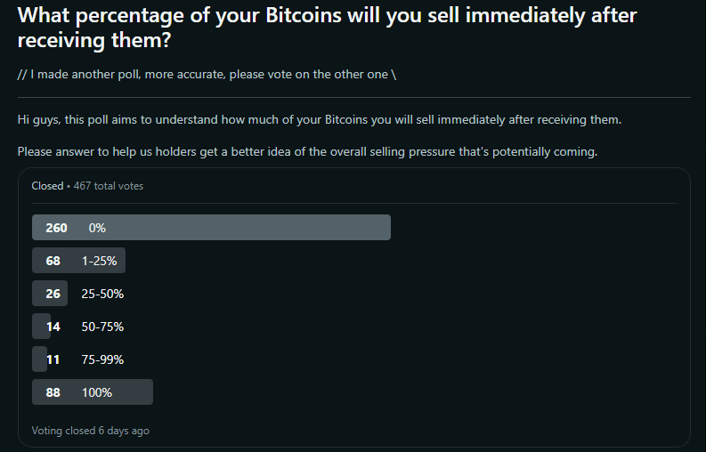Mt. Gox BTCs were on the move again this week, with roughly 100’000 BTC being sent to two unmarked addresses early during the week. Afterward, several community users reported receiving emails from the Kraken Exchange that stated that Kraken has successfully received creditor funds from the Mt. Gox trustee and that it will take them 7–14 days to deposit the funds into the user accounts. The question we all are asking ourselves is, how many of the users who get some of their long-lost BTC back will actually sell their newly acquired BTC and become wealthy fiat holders? A vote on the Reddit Mt. Gox forum suggests that out of 467 participants, 260 (55%) chose to not sell their BTCs after receiving the compensation, while 88 (18%) chose to sell it all. Of course, this vote is not worth much, but it’s still interesting to see that not everyone might actually sell everything as a certainty. Time will tell!