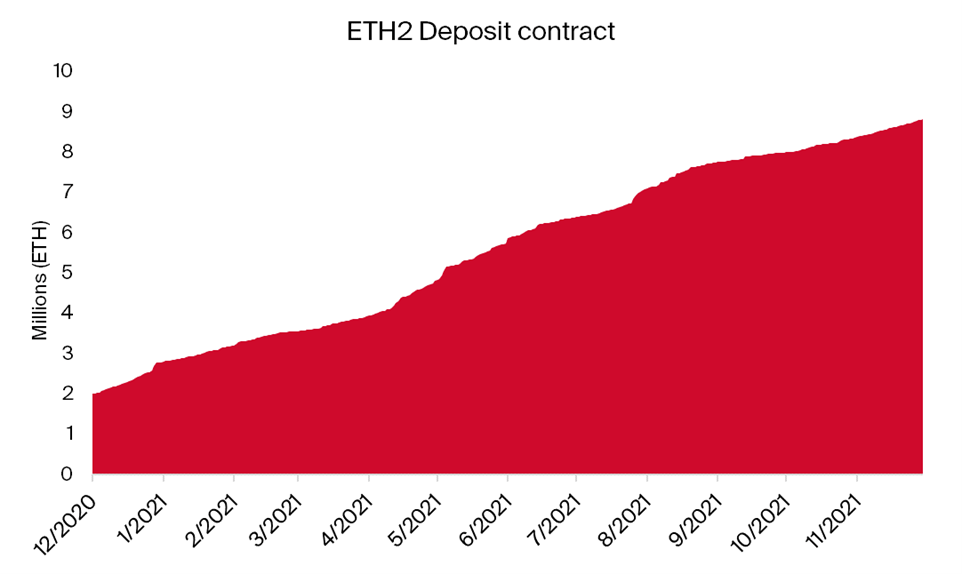 - More than ETH 8.8 million have been deposited into the ETH2 contract, representing approximately 7% of the current circulating supply. That number is expected to grow substantially until the merger of chain. Although, it remains to be seen when the actual merger will take place.