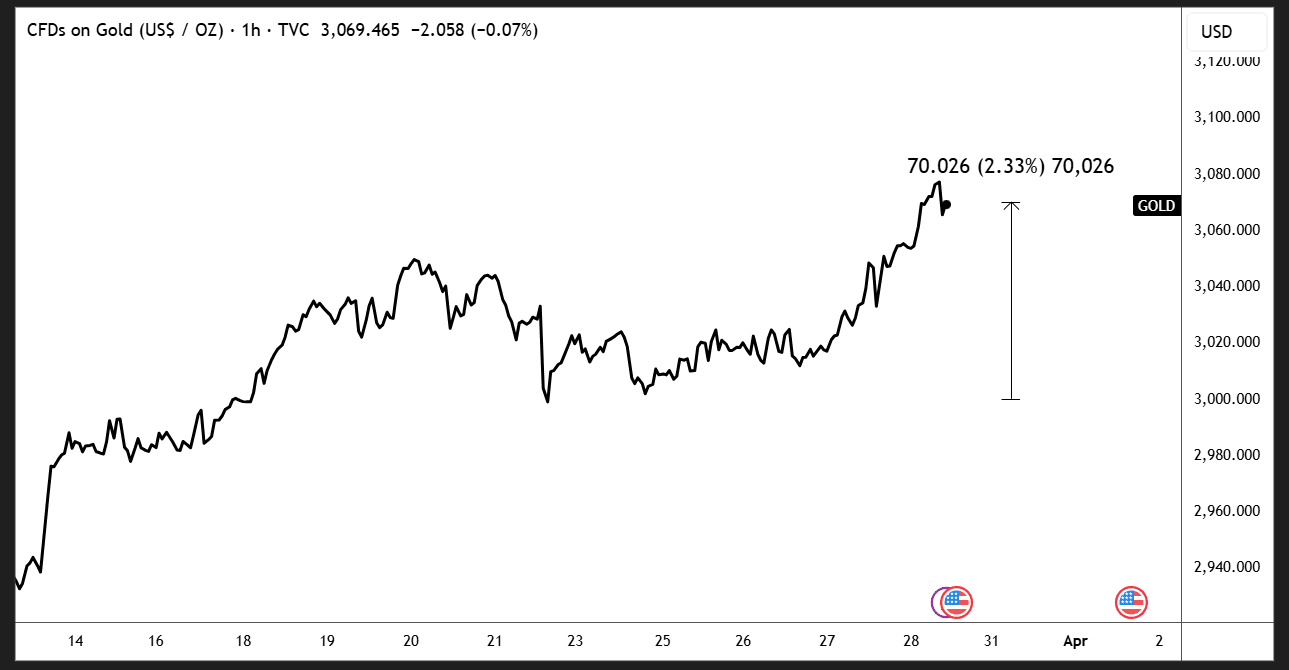 While U.S. stocks and the crypto markets are characterized by uncertainty, this uncertainty is also reflected in the gold chart, being up more than 2 percent this week – reaching a new all-time high above $3’070 per ounce.