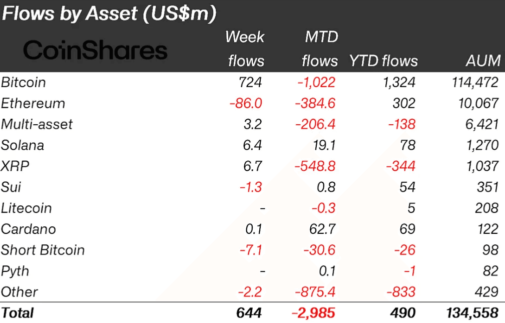 Last week, digital asset investment products finally managed to end their streak of net outflows by bringing in $644 million in inflows. Bitcoin continues to attract the bulk of the flows, with $734 million in net inflows while Ethereum experienced net outflows of $86 million last week. While the flows were in the positive again last week for bitcoin, the month-to-date figures are still looking grim, with net outflows for bitcoin continuing to stay above $1 billion so far, XRP currently saw total net outflows of almost $550 million this month and Ethereum almost $400 million, as the table below shows.
