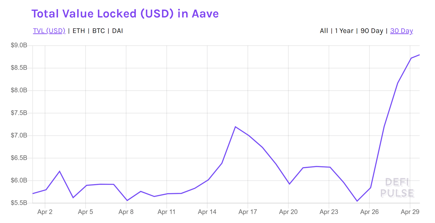 - Currently, this results in yields of 4-10% for borrowing various stablecoins; total value locked in Aave has jumped from $6 billion to $8 billion.