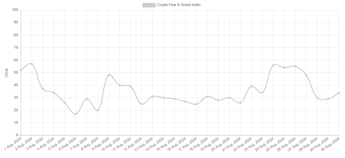 The crypto market sentiment is lingering back in fear territory after a couple of days at neutral levels over the last weekend. Funding rates for the major cryptocurrencies have been neutral since early April, and total liquidations have also been rather low, except for the crash on Monday, August 5, where we saw a huge liquidation cascade. The Bitcoin sentiment survey from Coinglass indicates, however, that market participants are rather leaning towards the bullish side, with 35 percent being bullish and 19 percent saying that they feel very bullish.