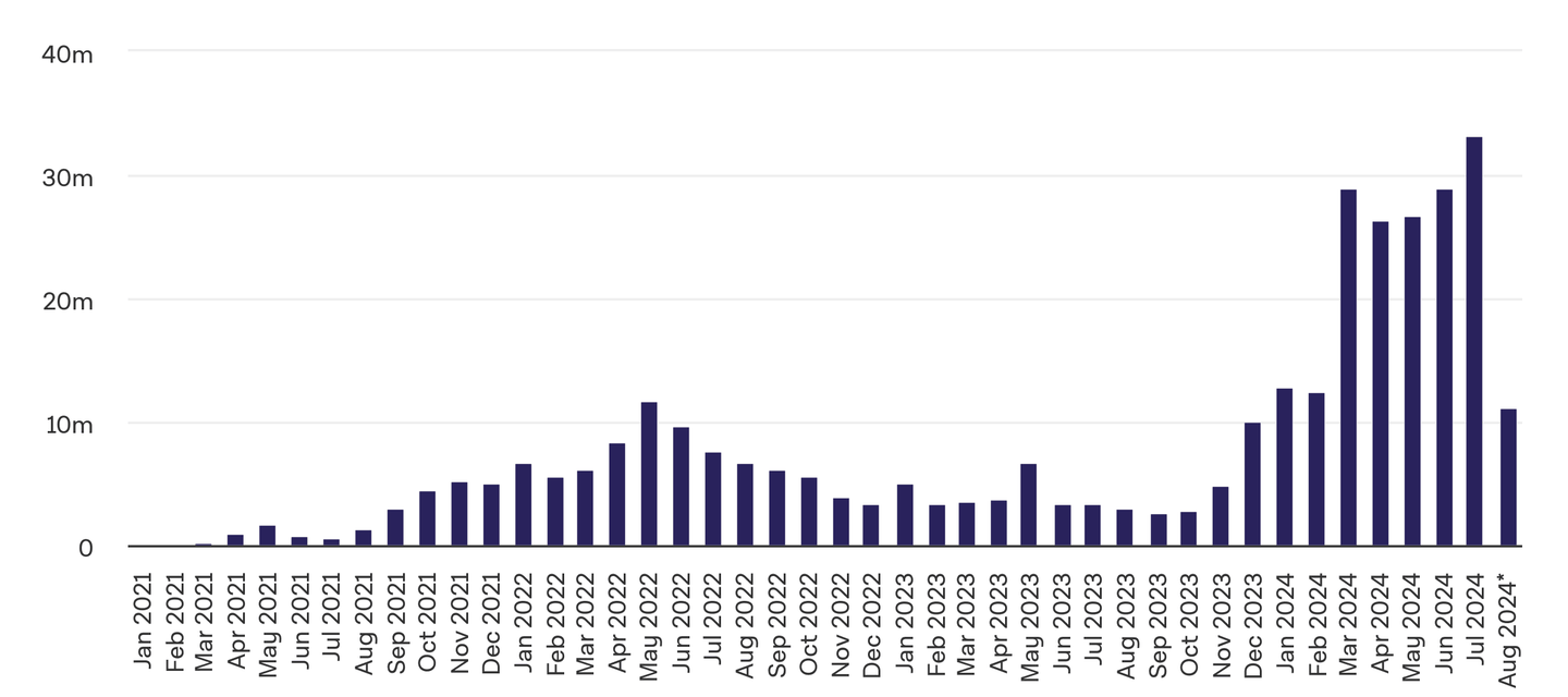 Last week, digital asset investment products marked the largest inflows in five weeks, with $533 million of net inflows. The Bitcoin spot ETFs saw $252 million of net inflows on Friday alone, likely due to Jerome Powell’s speech at the Jackson Hole symposium, which sent the markets on an upward tear. While the Bitcoin spot ETFs recorded five days of net inflows last week, the Ethereum spot ETFs saw five red days with net outflows, although the outflows from Grayscale’s ETHE further slowed down last Friday, a trend that continued this week. Wednesday this week in fact marked the first net inflow day for the ETH spot ETFs since August 15. While the BTC spot ETFs experienced a positive week last week, this week was accompanied by some net outflow days after net inflows of $200 million on Monday.